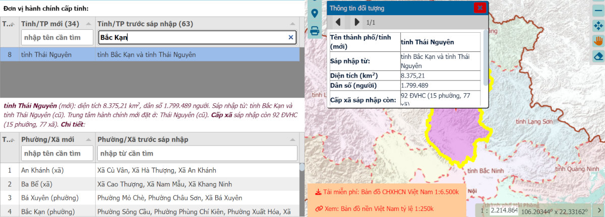 - Bước 2: Nhập tên tỉnh Thái Nguyên và tên xã, phường (sau sáp nhập) cần tìm vào ô tìm kiếm. Hệ thống sẽ hiển thị chi tiết ranh giới và bản đồ của khu vực mới kèm theo các thông tin quan trọng khác.