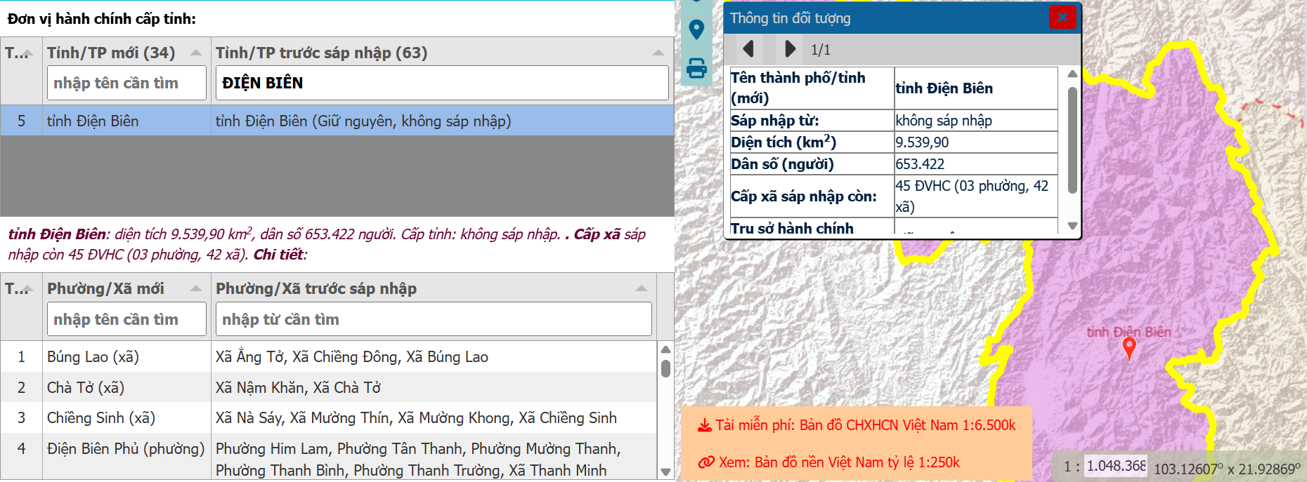 - Bước 2: Nhập "Tỉnh Điện Biên" và tên xã/phường cần tìm vào ô tìm kiếm. Hệ thống sẽ hiển thị ranh giới và tên gọi chính xác sau sáp nhập.