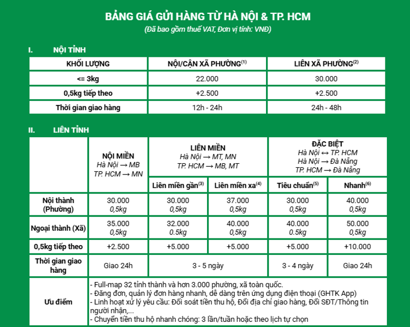 | Phạm vi áp dụng | Toàn quốc (Nội tỉnh, liên tỉnh, liên miền). | Nội thành Hà Nội và TP Hồ Chí Minh. | Toàn quốc. |
