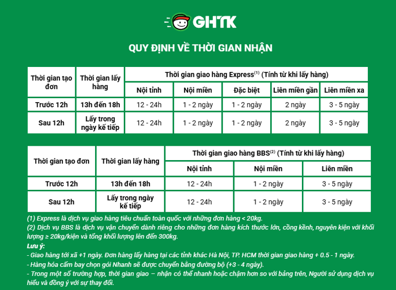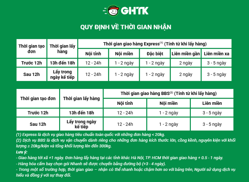 - Giao nội tỉnh: 12h - 24h (ví dụ: Hà Nội, TP.HCM)