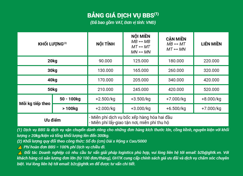 Dịch vụ giao hàng toàn quốc BBS được tính giá dựa trên trọng lượng thực tế hoặc trọng lượng quy đổi (tùy theo kích thước), khoảng cách vận chuyển và loại hàng hóa cồng kềnh. Do tính chất đặc thù hàng hóa lớn, cước phí sẽ được tính toán chi tiết cho từng đơn hàng.