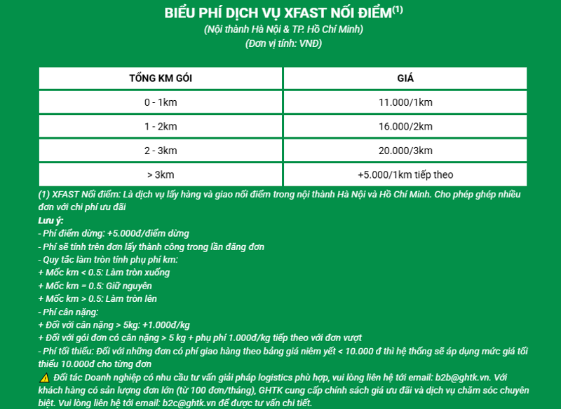 Dịch vụ XFAST nối điểm có mức giá cố định cho các đơn hàng trong phạm vi nội thành Hà Nội và TP Hồ Chí Minh, với mức phụ phí nhỏ cho mỗi kg tăng thêm.