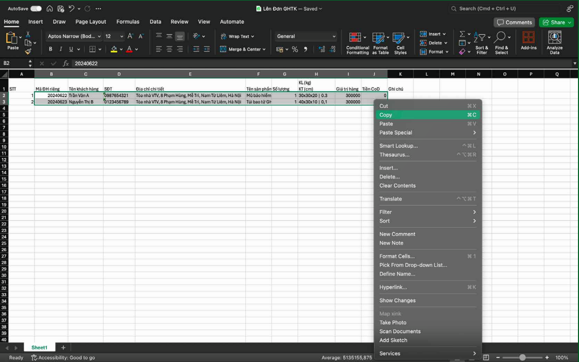 - Bước 5: Bạn quay lại màn hình Đăng đơn Excel, ấn vào dòng đầu tiên của cột Mã ĐH riêng, thao tác Sao chép và Dán thông tin đơn hàng từ file đã tạo ở B4 vào bảng