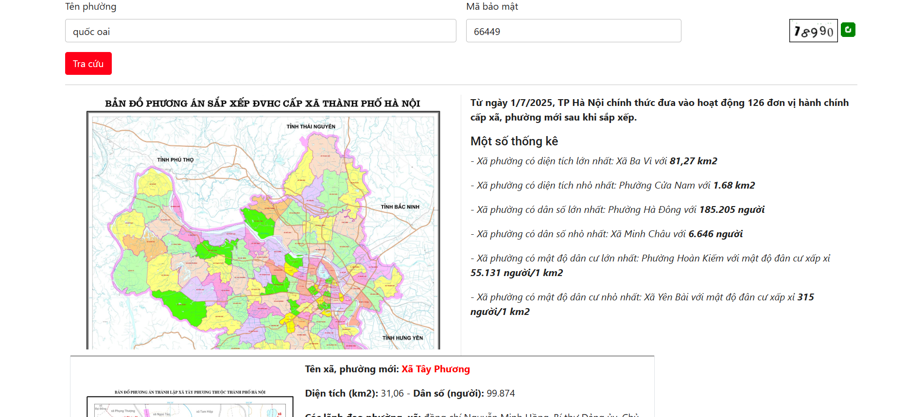 - Cách 1: Tra cứu tại cổng thông tin bản đồ https://sapnhap.bando.com.vn/. Tại đây, sau khi nhập "Thành phố Hà Nội" và "Huyện Quốc Oai", bạn tìm kiếm tên đơn vị mới (ví dụ: "Xã Tây Phương") trong danh sách kết quả. Hệ thống sẽ tô màu ranh giới mới và hiển thị chi tiết các khu vực trước đây thuộc về đơn vị nào đã được sáp nhập.