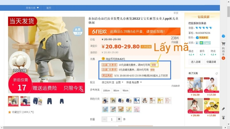 Đây là loại mã dễ áp nhất vì liên quan trực tiếp đến sản phẩm bạn đang xem. Chỉ cần bấm “领取” là mã tự được lưu vào tài khoản.