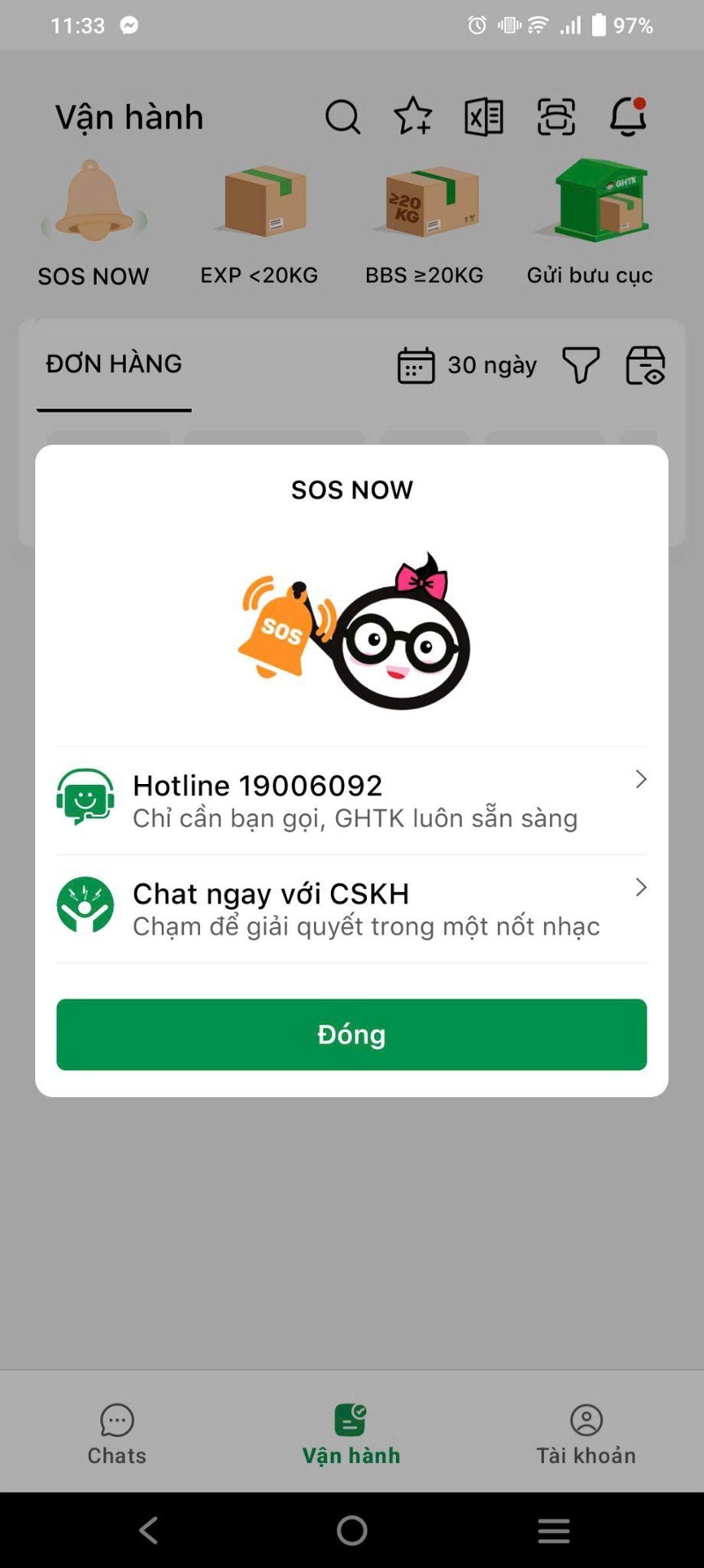 Trong trường hợp này, chủ shop có thể sử dụng tính năng “SOS NOW” để liên hệ nhân viên chăm sóc khách hàng của GHTK để được hỗ trợ nhanh nhất.