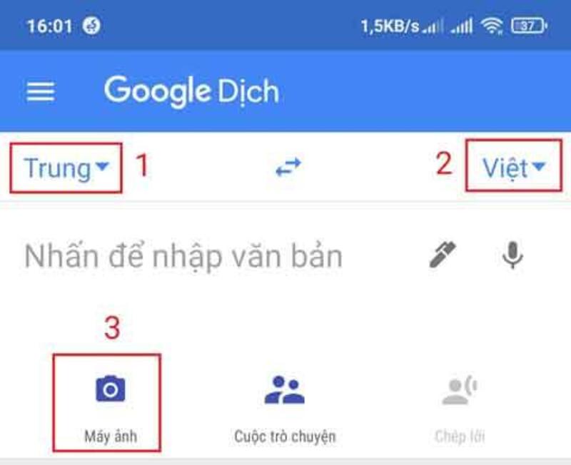 Sau khi đã chụp lại màn hình chứa những thông tin muốn hiểu rõ, bạn hãy mở ứng dụng Google Dịch đã cài ở bước 1. Tại đây, bạn chỉ cần thiết lập một vài tùy chọn trước khi bắt đầu dịch ảnh.