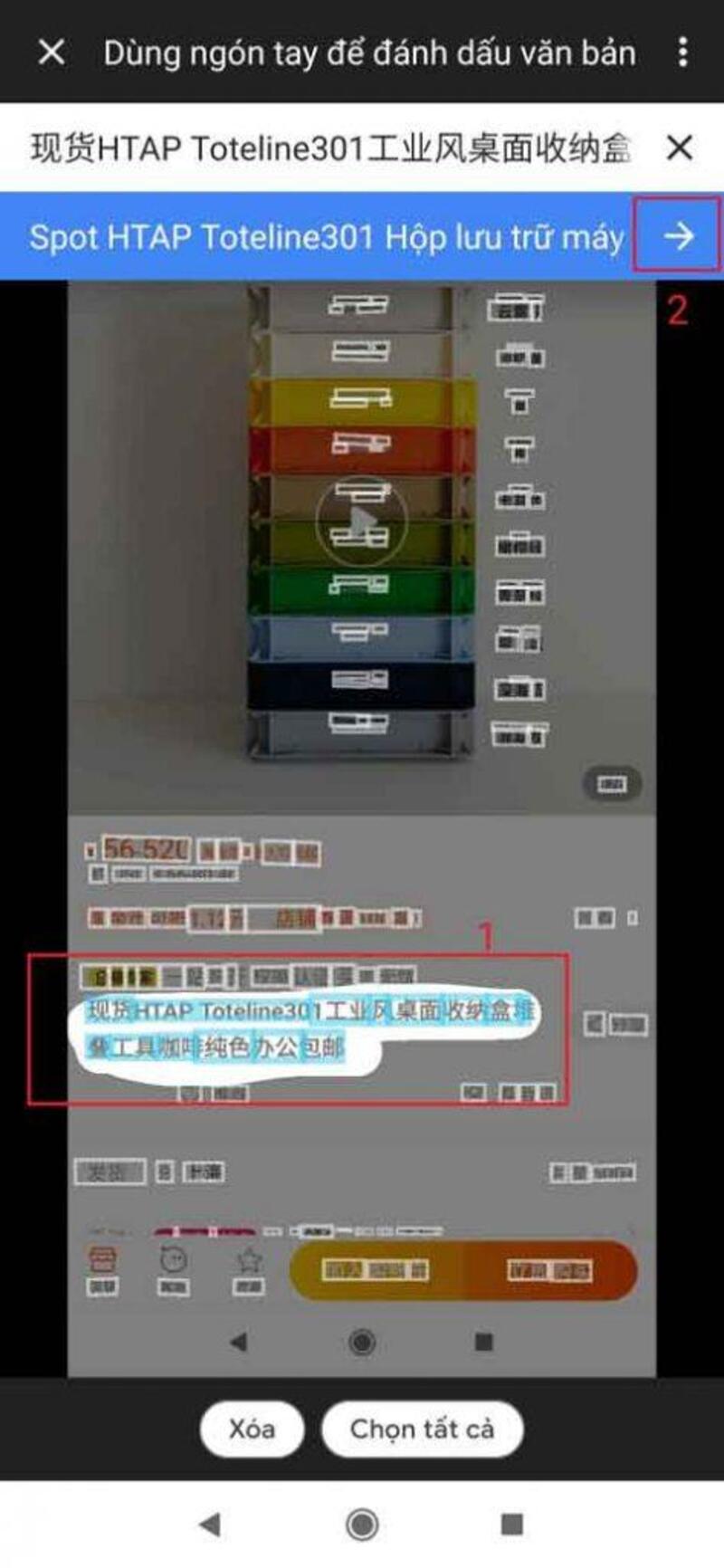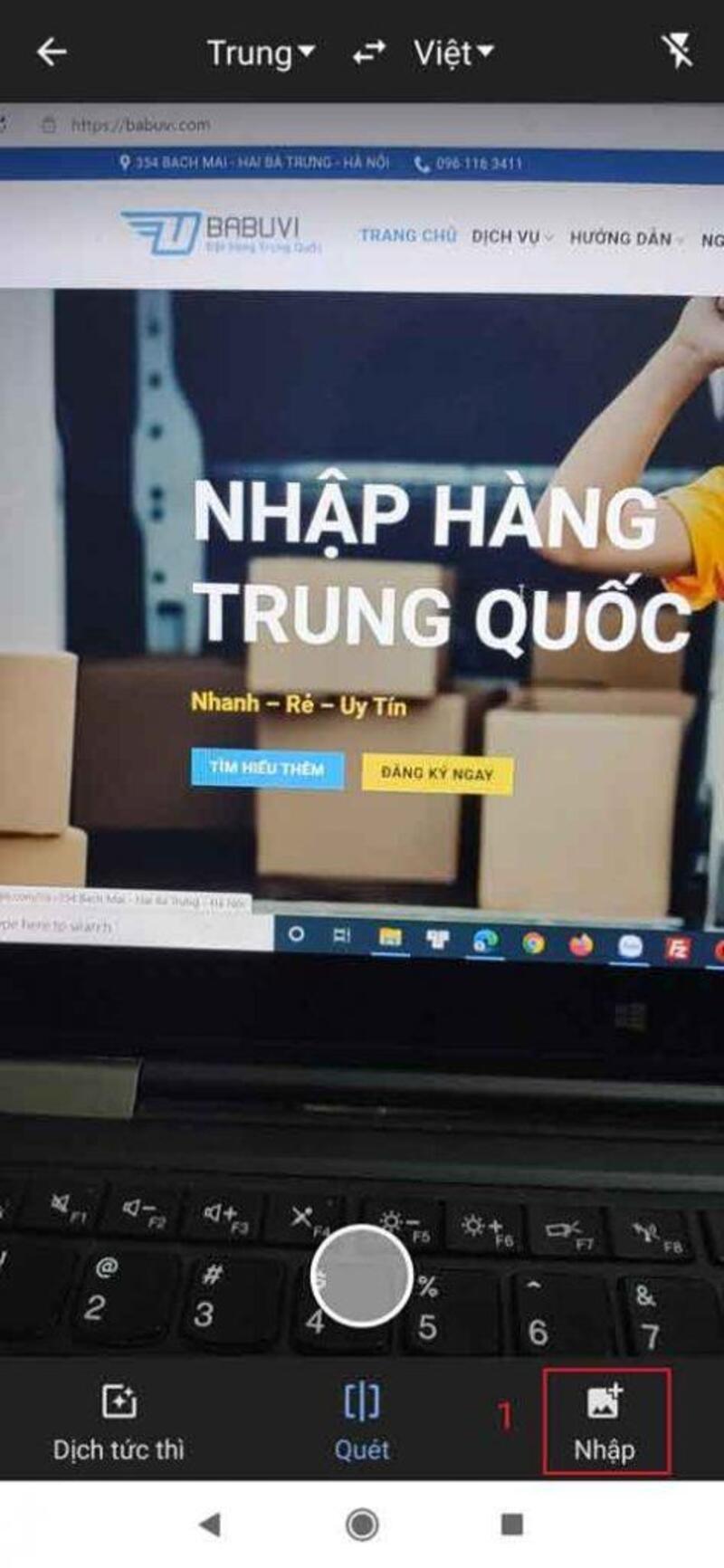 Sau khi chuyển sang chế độ dịch bằng hình ảnh, bạn hãy nhấn vào nút “Nhập” (được đánh dấu số 1 trong hình minh họa). Tiếp đó, hãy chọn ảnh chụp màn hình chứa thông tin sản phẩm mà bạn muốn dịch sang tiếng Việt ở bước trước. Ngay lập tức, Google Dịch sẽ hiển thị giao diện dịch nội dung Taobao sang tiếng Việt như ví dụ bên dưới.