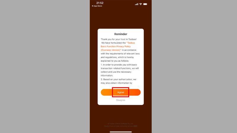 2- Đọc và đồng ý toàn bộ điều khoản sử dụng: Khi mở Taobao lần đầu tiên, bạn sẽ thấy màn hình hiển thị các điều khoản sử dụng của nền tảng. Hãy đọc qua và nhấn vào nút màu cam (như hình minh họa) để đồng ý và tiếp tục sang bước đăng ký tài khoản.
