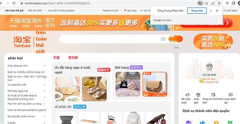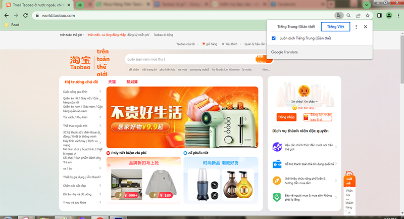 3- Sử dụng Google Dịch hoặc thiết lập tính năng dịch tự động: Ngay sau đó, giao diện Taobao sẽ xuất hiện hoàn toàn bằng tiếng Trung. Điều này có thể khiến bạn hơi bối rối nếu không quen ngôn ngữ. Vì vậy, để thao tác dễ dàng hơn, bạn có thể sử dụng Google Dịch hoặc thiết lập tính năng dịch tự động để chuyển nội dung sang tiếng Việt.