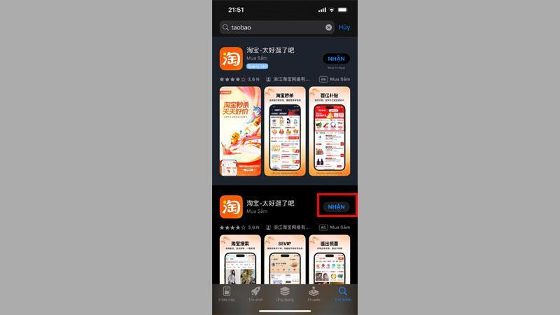 1- Tải app mua hàng Taobao: Trước tiên, hãy mở CH Play nếu bạn dùng điện thoại Android hoặc App Store nếu bạn sử dụng iPhone. Tại ô tìm kiếm, nhập từ khóa “Taobao”, kiểm tra đúng ứng dụng chính chủ rồi nhấn Tải xuống/Cài đặt để thêm ứng dụng vào máy.