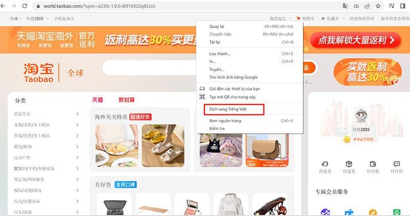 Trong trường hợp trình duyệt không hiện thông báo, bạn chỉ cần nhấp chuột phải vào trang và chọn “Dịch sang tiếng Việt”. Chỉ với thao tác này, bạn đã có thể xem thông tin sản phẩm trên Taobao bằng tiếng Việt một cách dễ dàng.