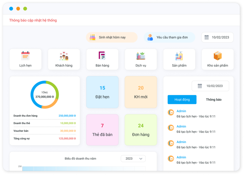 - Quản lý thu–chi, công nợ, báo cáo doanh thu và lợi nhuận: Có đầy đủ báo cáo doanh thu, lợi nhuận theo dịch vụ/nhân viên/thời điểm; hỗ trợ công nợ với khách hoặc nhà cung cấp, giúp bạn dễ dàng kiểm soát tài chính.