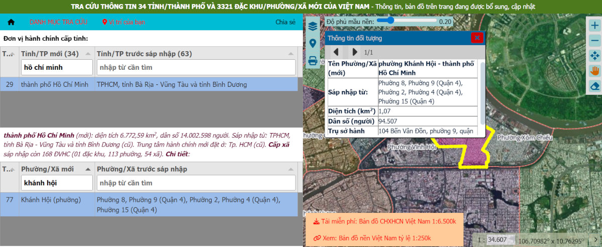 - Bước 2: Nhập "Thành phố Hồ Chí Minh" và tên "Phường Khánh Hội" (Quận 4) vào ô tìm kiếm. Hệ thống sẽ hiển thị chi tiết ranh giới mới bao trùm khu vực phường 10 cũ để người dân tiện đối chiếu.