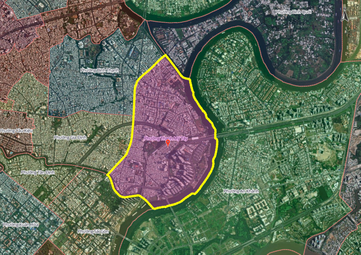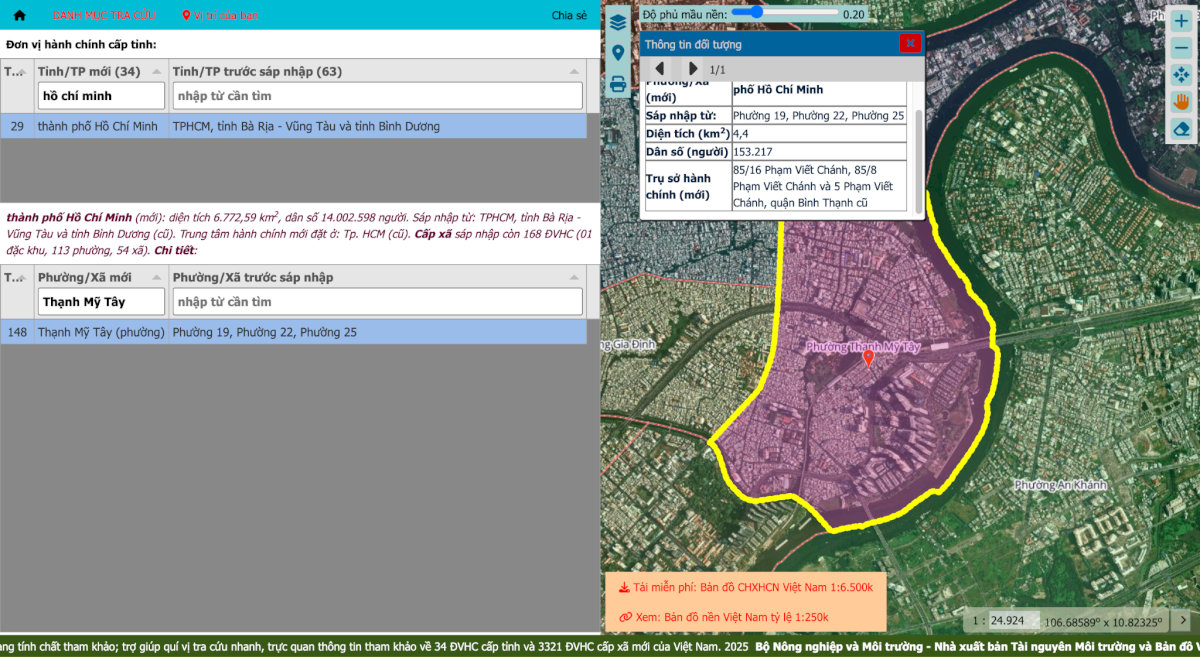 - Bước 2: Nhập Tỉnh/Thành phố và tên Phường/Xã mới (nhập "Phường Thạnh Mỹ Tây") vào thanh công cụ tìm kiếm. Hệ thống sẽ hiển thị bản đồ chi tiết và xác định các khu vực dân cư thuộc phạm vi quản lý mới.