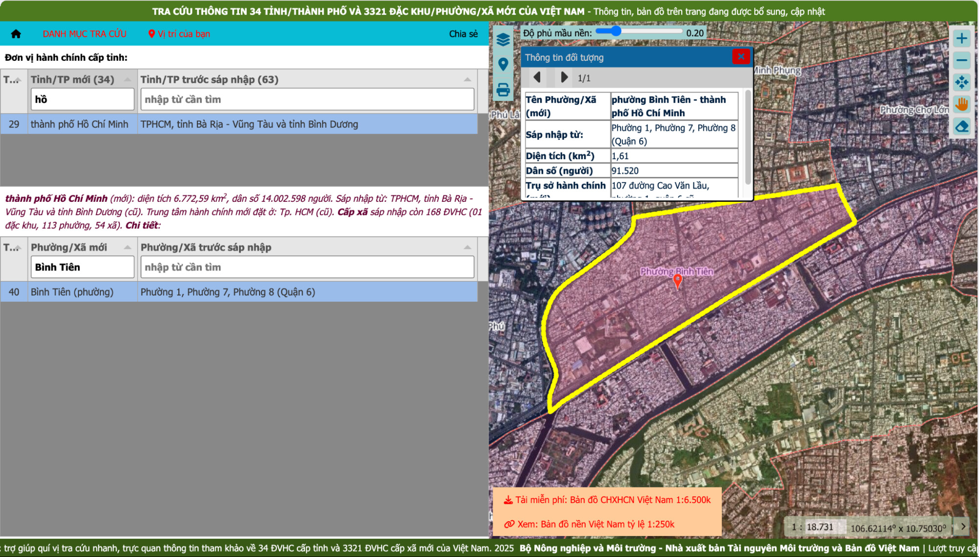 - Bước 2: Nhập Tỉnh/Thành phố và tên Phường/Xã mới (Phường Bình Tiên) vào thanh công cụ tìm kiếm. Hệ thống sẽ hiển thị bản đồ chi tiết và xác định các khu vực dân cư thuộc phạm vi quản lý mới.