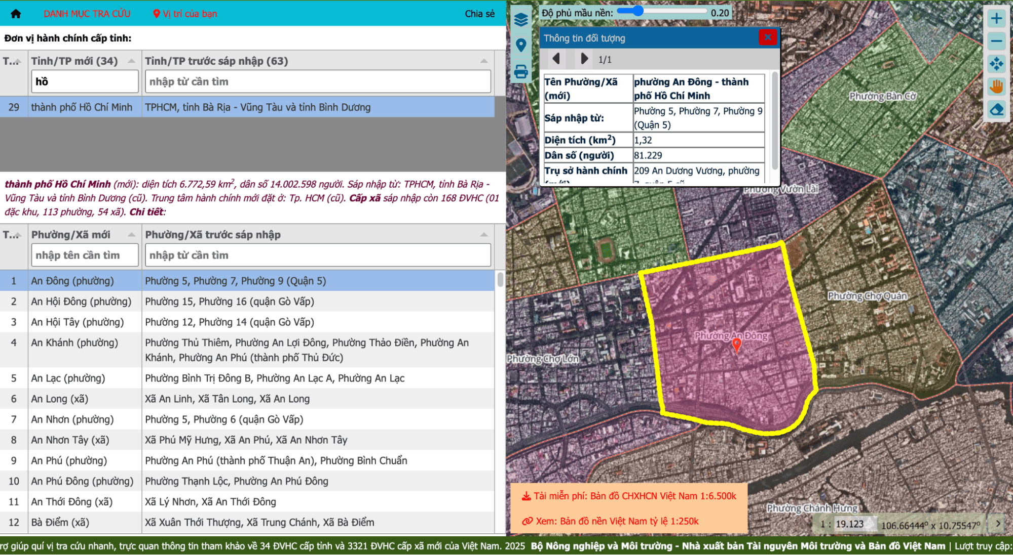 - Bước 2: Nhập Tỉnh/Thành phố và tên Phường/Xã mới (Phường An Đông) vào ô tìm kiếm. Kết quả sẽ hiển thị chi tiết bản đồ phân chia địa giới và các khu vực dân cư thuộc quyền quản lý mới.