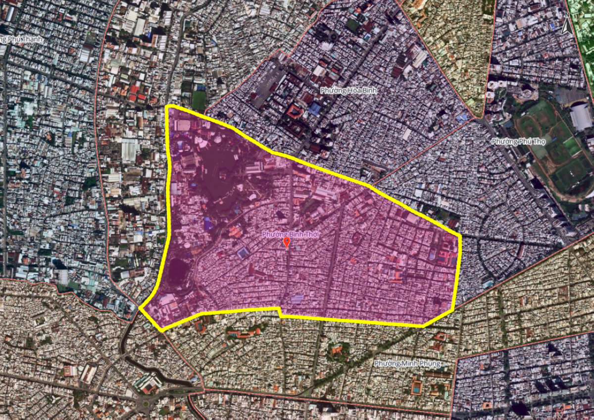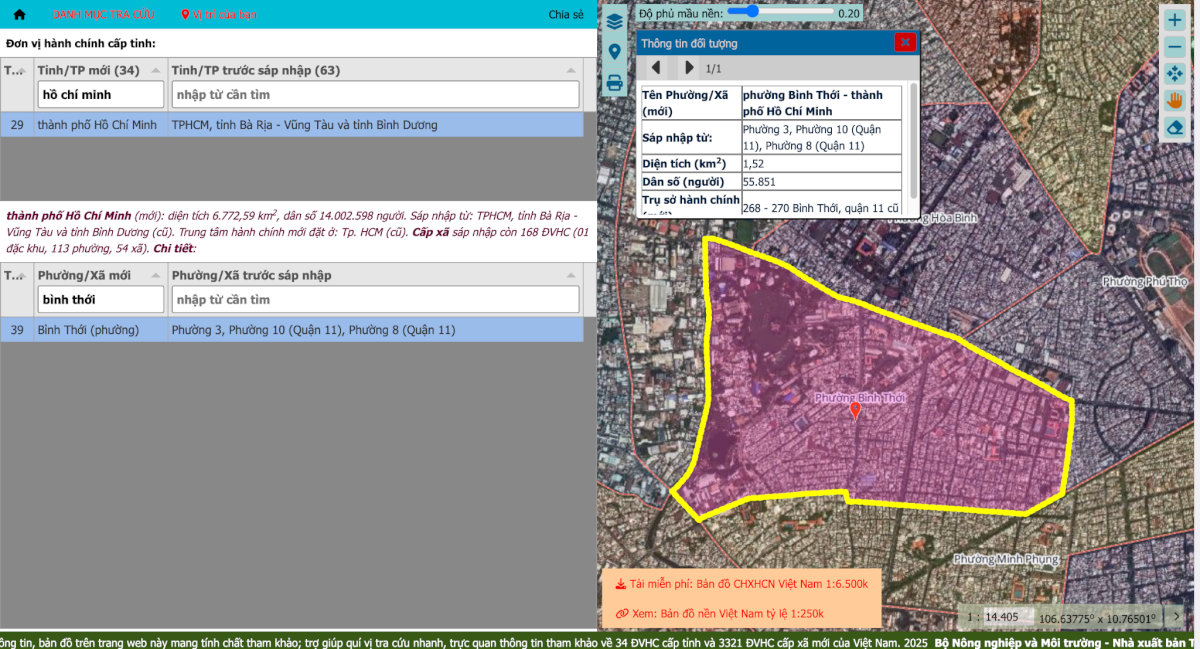 - Bước 2: Nhập Tỉnh/Thành phố và tên Phường/Xã mới (Phường Bình Thới) vào ô tìm kiếm. Hệ thống sẽ hiển thị ranh giới chi tiết và các khu vực dân cư thuộc phạm vi quản lý mới.