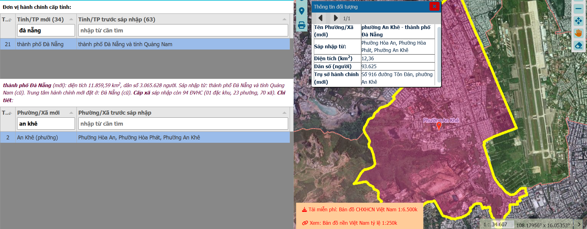 - Bước 2: Nhập "Đà Nẵng" và tên "Phường An Khê" vào ô tìm kiếm. Hệ thống sẽ hiển thị ranh giới rõ ràng và chi tiết các khu vực đã được sáp nhập.
