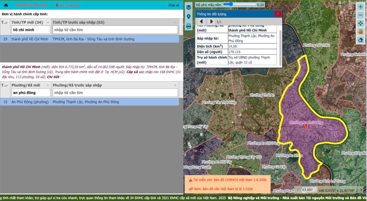 Bước 2: Tại thanh công cụ, nhập Tỉnh/Thành phố và tên Phường/Xã mới cần tra cứu. Kết quả sẽ hiển thị chi tiết ranh giới và các khu vực dân cư thuộc phạm vi quản lý mới.