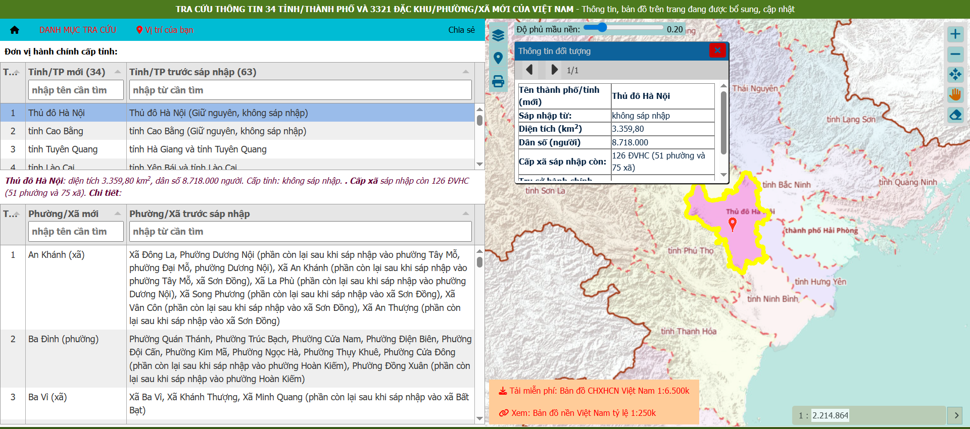 - Bước 2: Nhập tên tỉnh/thành phố và tên xã, phường (sau sáp nhập) cần tìm vào ô tìm kiếm. Hệ thống sẽ hiển thị chi tiết ranh giới và bản đồ của khu vực mới kèm theo các thông tin quan trọng khác như diện tích, dân số,...