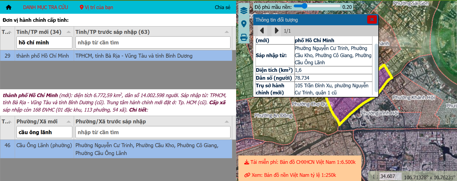 Bước 2: Nhập Tỉnh/Thành phố và tên Phường/Xã sau sáp nhập cần tìm vào ô tìm kiếm (Lưu ý: Tìm kiếm với từ khóa "Phường Cầu Ông Lãnh"). Hệ thống sẽ hiển thị ranh giới rõ ràng và chi tiết các khu vực đã được sáp nhập.