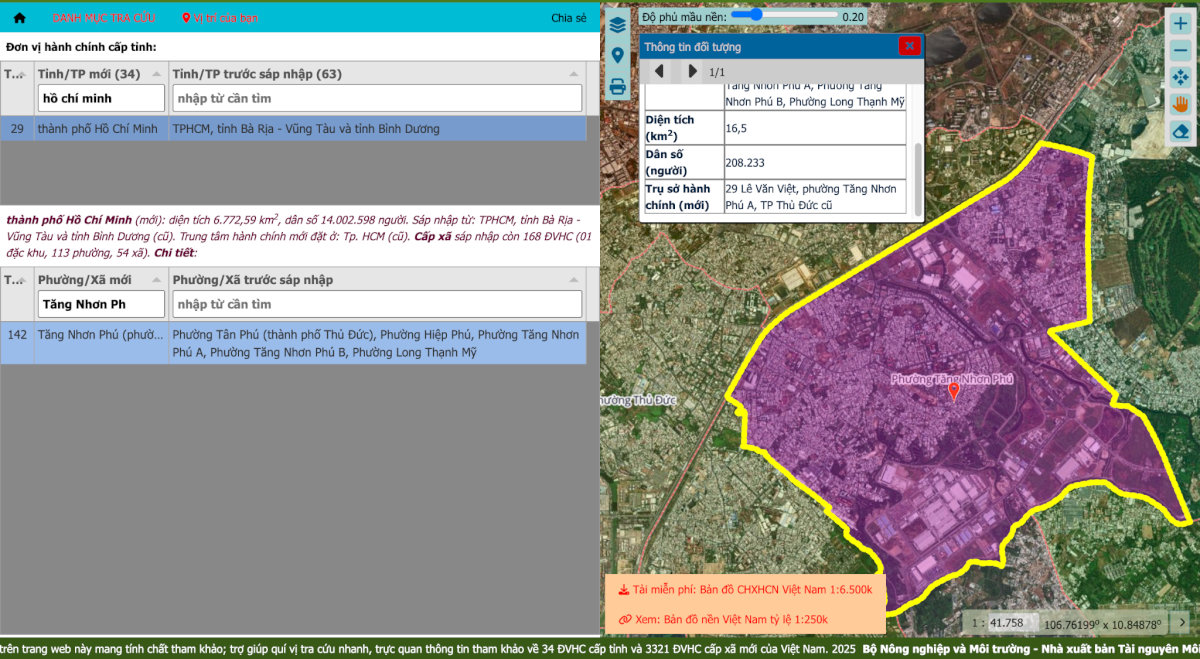 - Bước 2: Nhập thông tin Tỉnh/Thành phố và tên Phường/Xã sau sáp nhập cần tìm kiếm. Hệ thống sẽ trả về kết quả hiển thị ranh giới rõ ràng và chi tiết của các khu vực đã sáp nhập.