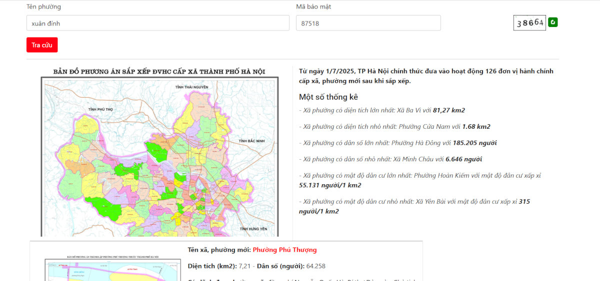 - Cách 1: Tra cứu tại cổng thông tin bản đồ https://sapnhap.bando.com.vn/. Tại đây, bạn chỉ cần tìm kiếm tên đơn vị mới (ví dụ: "Phường Xuân Đỉnh") trên thanh công cụ. Hệ thống sẽ tô màu ranh giới mới và hiển thị chi tiết các khu vực trước đây thuộc về đơn vị nào đã được sáp nhập.