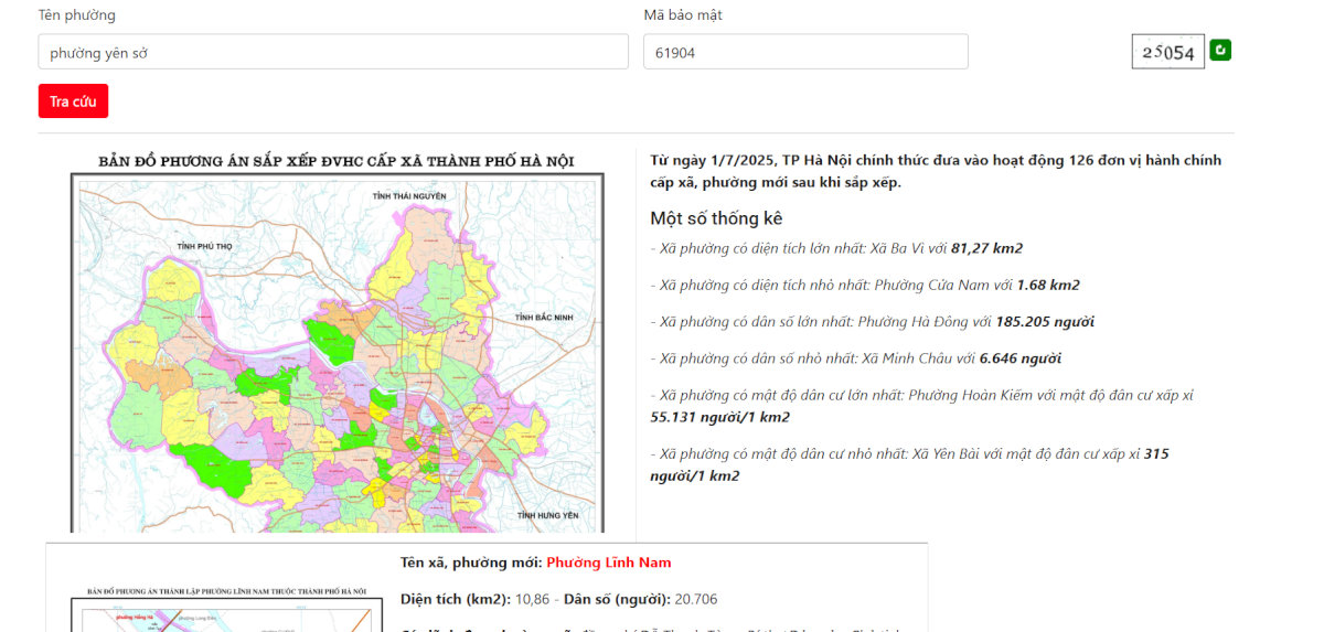 - Cách 1: Tra cứu tại cổng thông tin bản đồ https://sapnhap.bando.com.vn/. Tại đây, bạn chỉ cần tìm kiếm tên đơn vị mới (ví dụ: "Phường Yên Sở") trên thanh công cụ. Hệ thống sẽ tô màu ranh giới mới và hiển thị chi tiết các khu vực trước đây thuộc về đơn vị nào đã được sáp nhập.