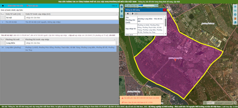 - Cách 1: Tra cứu tại cổng thông tin bản đồ https://sapnhap.bando.com.vn/. Tại đây, sau khi nhập "Thành phố Hà Nội", bạn tìm kiếm tên các phường mới thuộc quậnLong Biên (cũ) trong danh sách kết quả. Hệ thống sẽ tô màu ranh giới mới và hiển thị chi tiết các khu vực trước đây thuộc về phường nào đã được sáp nhập vào.