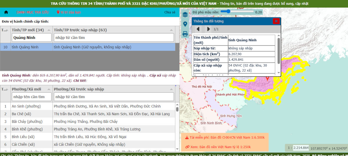 - Bước 2: Chọn mục "Quảng Ninh" và nhập tên phường/xã cần tìm kiếm. Hệ thống sẽ hiển thị sơ đồ ranh giới chi tiết cùng các số liệu dân số, diện tích sau khi điều chỉnh.