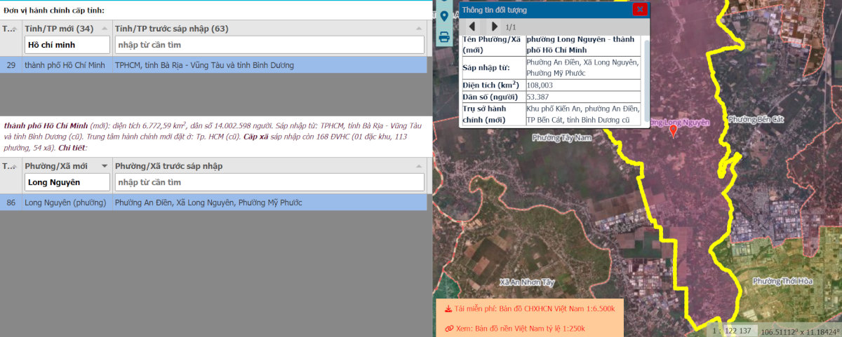 - Bước 2: Nhập Tỉnh/Thành phố và tên Phường/Xã sau sáp nhập cần tìm vào ô tìm kiếm. Hệ thống sẽ hiển thị ranh giới rõ ràng và chi tiết các khu vực đã được sáp nhập.