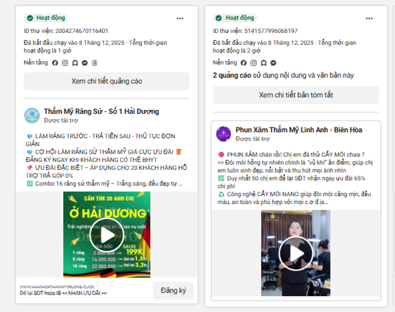 3 - Khơi nguồn ý tưởng sáng tạo: Thư viện quảng cáo FB cho phép bạn tiếp cận hàng nghìn mẫu tiêu đề (Headline), hình ảnh và video bắt mắt đang chạy thực tế trên thị trường. Bạn có thể học cách họ xây dựng hook, cách họ sắp xếp thông tin, cách họ kêu gọi hành động để áp dụng vào sản phẩm của mình.