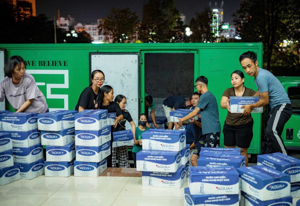 Những thùng nước sạch đang được mọi người sắp xếp lên xe để chuyển đến tỉnh Bắc Giang