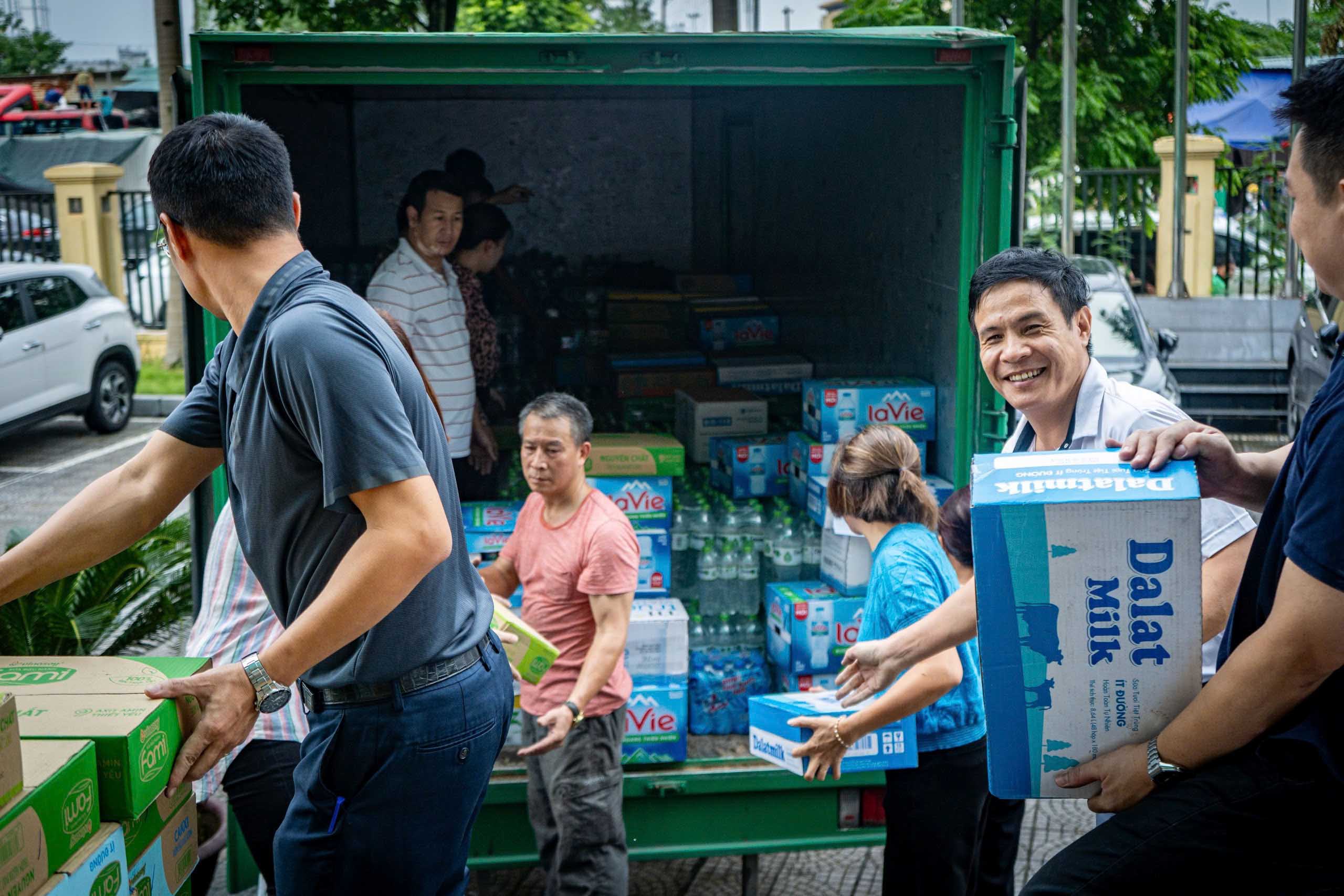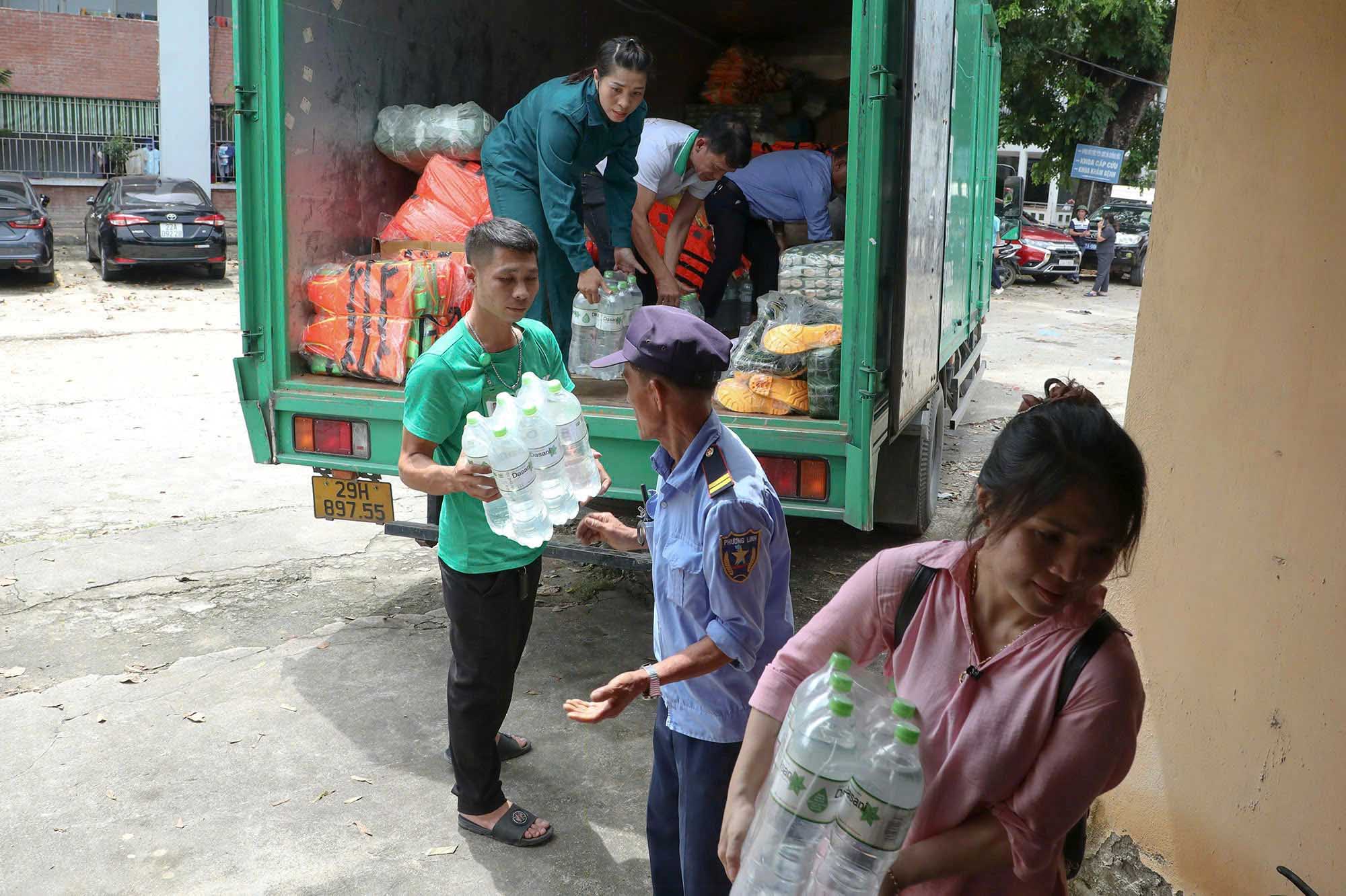 Những thùng nước sạch đang được mọi người sắp xếp lên xe để chuyển đến tỉnh Bắc Giang