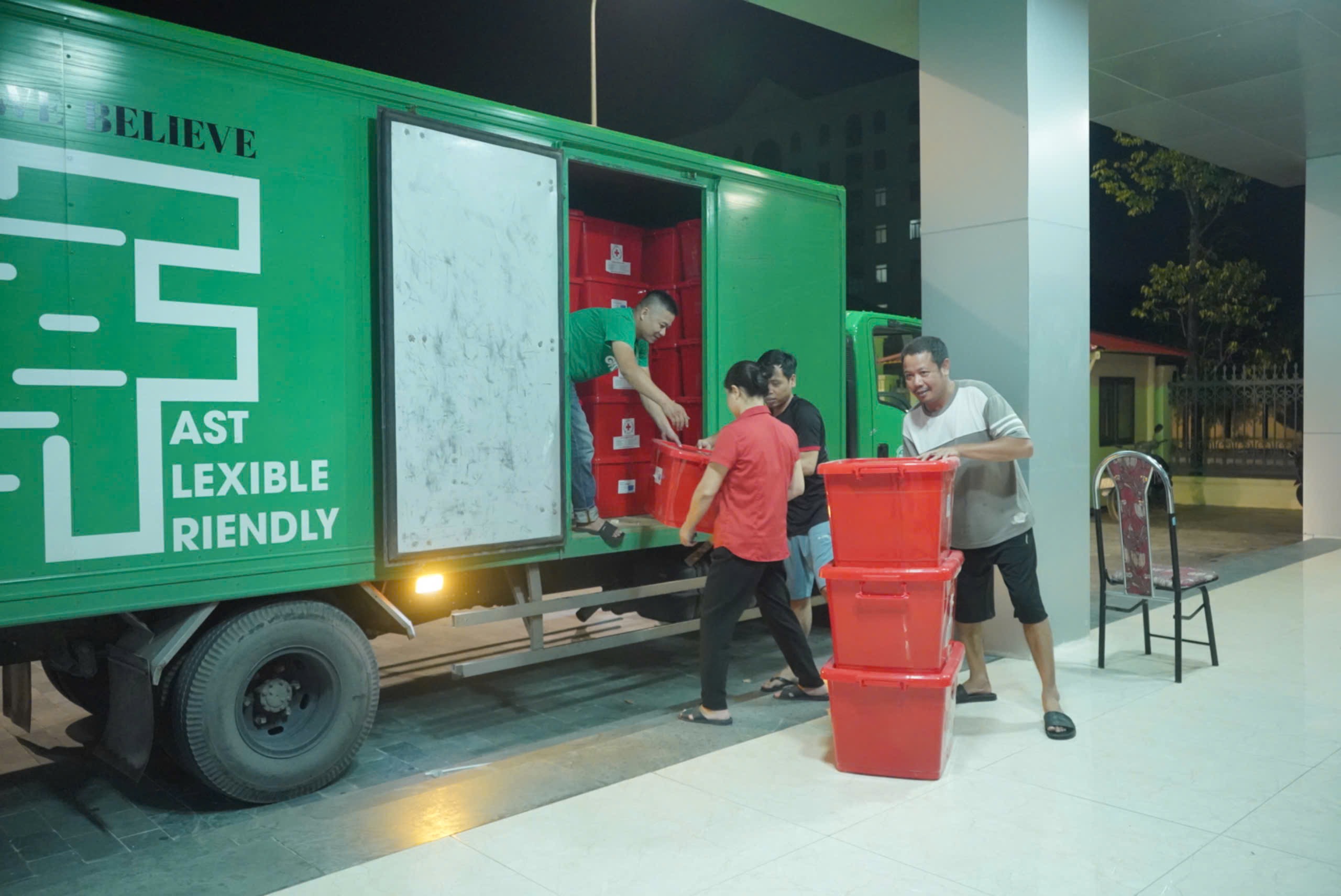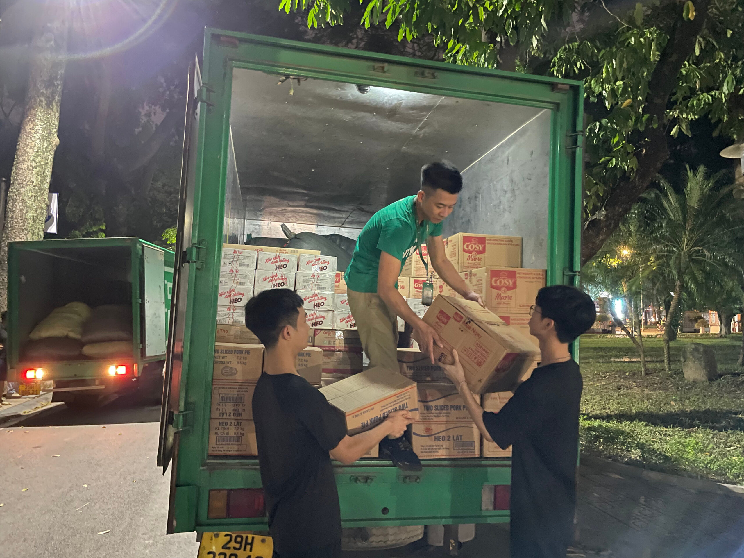 Không kể ngày đêm, những thùng hàng cứu trợ vẫn không ngừng được chất đầy xe để kịp sáng hôm sau trao gửi cho người dân vùng lũ