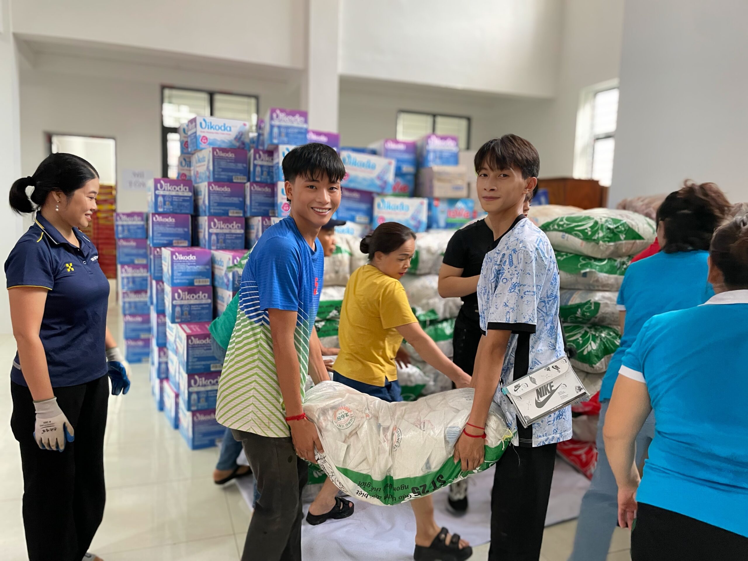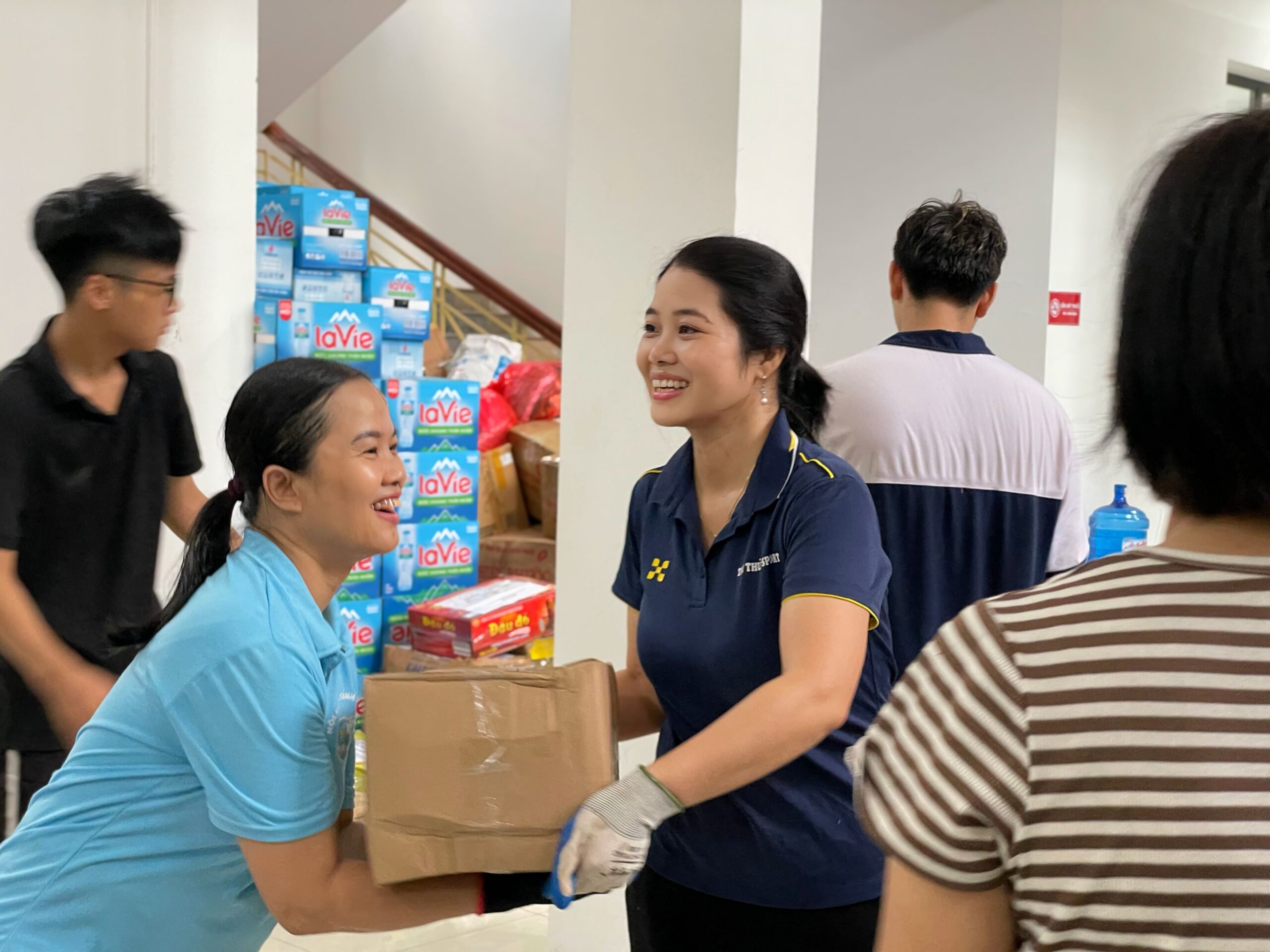 Người bê thùng nước, người bê thùng bánh, mỗi người một tay, chung sức hướng về đồng bào vùng bão lũ