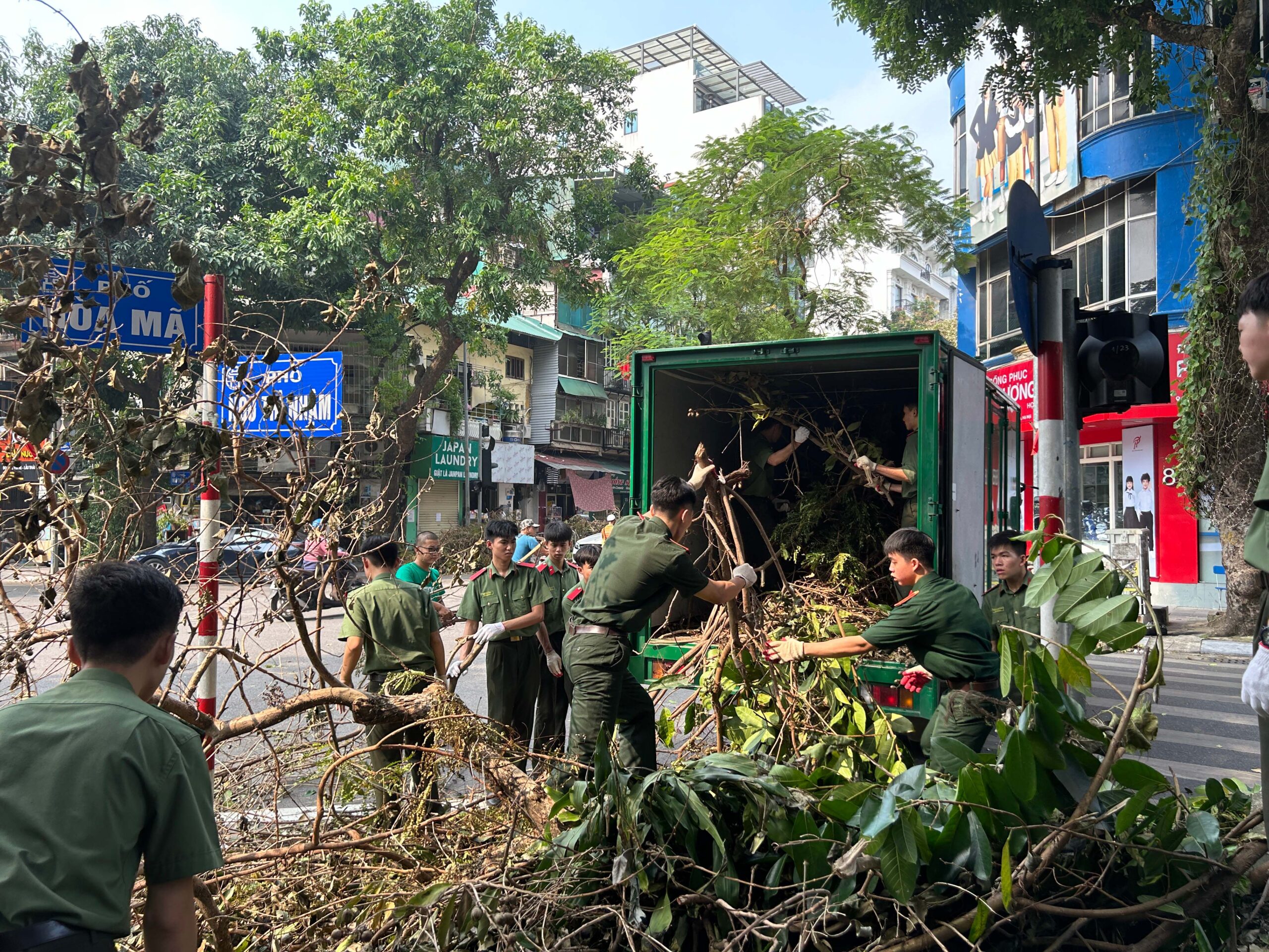 Cây cối gãy đổ nhanh chóng được thu gom về điểm tập kết để đảm bảo an toàn giao thông và cảnh quan trên từng tuyến phố