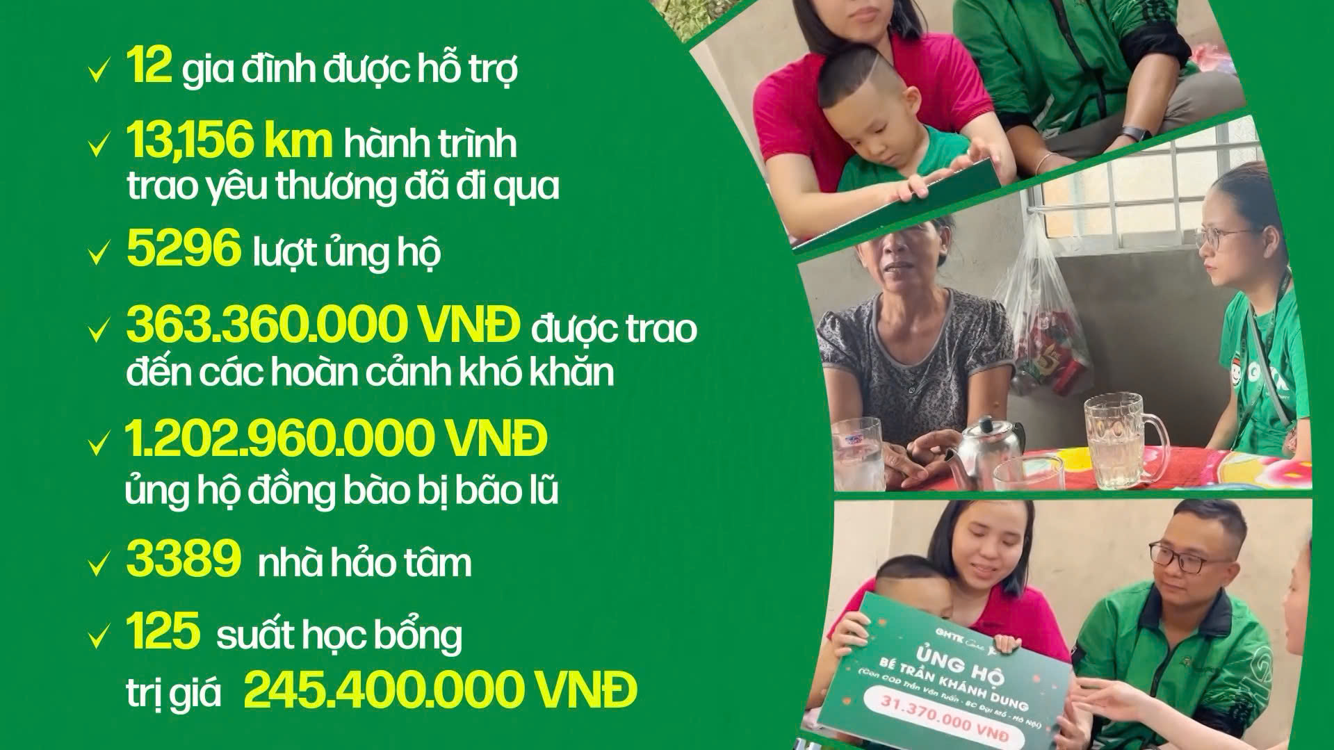 Mỗi đóng góp là một tia sáng thắp lên hy vọng. Hơn 363 triệu đồng là số tiền ủng hộ tới 12 hoàn cảnh khó khăn tính tới đầu tháng 12 năm 2024. Đồng thời, hơn 1,2 tỷ đồng số tiền ủng hộ đã được gửi đến đồng bào chịu ảnh hưởng bởi bão số 3, thể hiện tinh thần tương thân tương ái, lá lành đùm lá rách của Người GHTK.