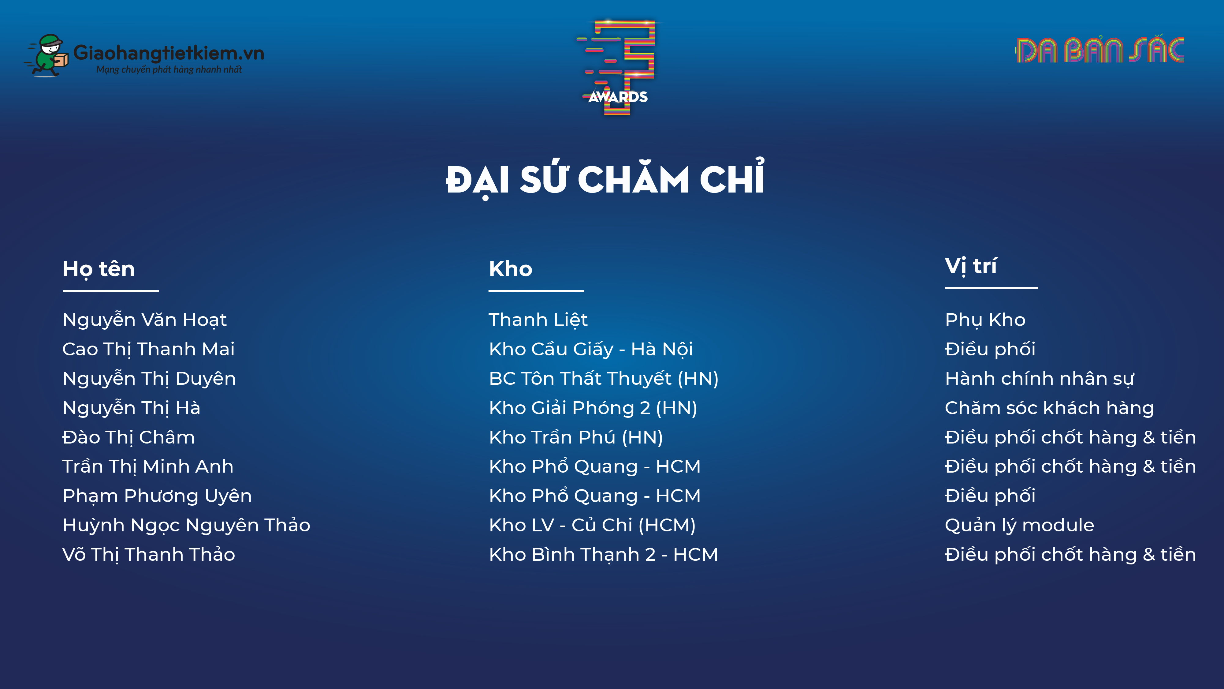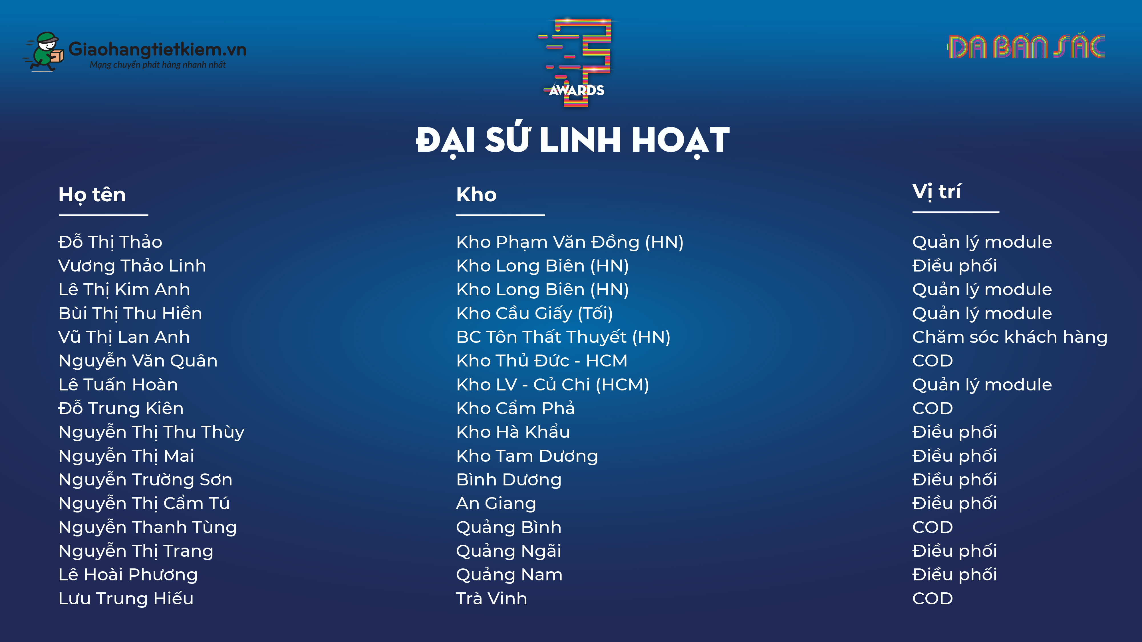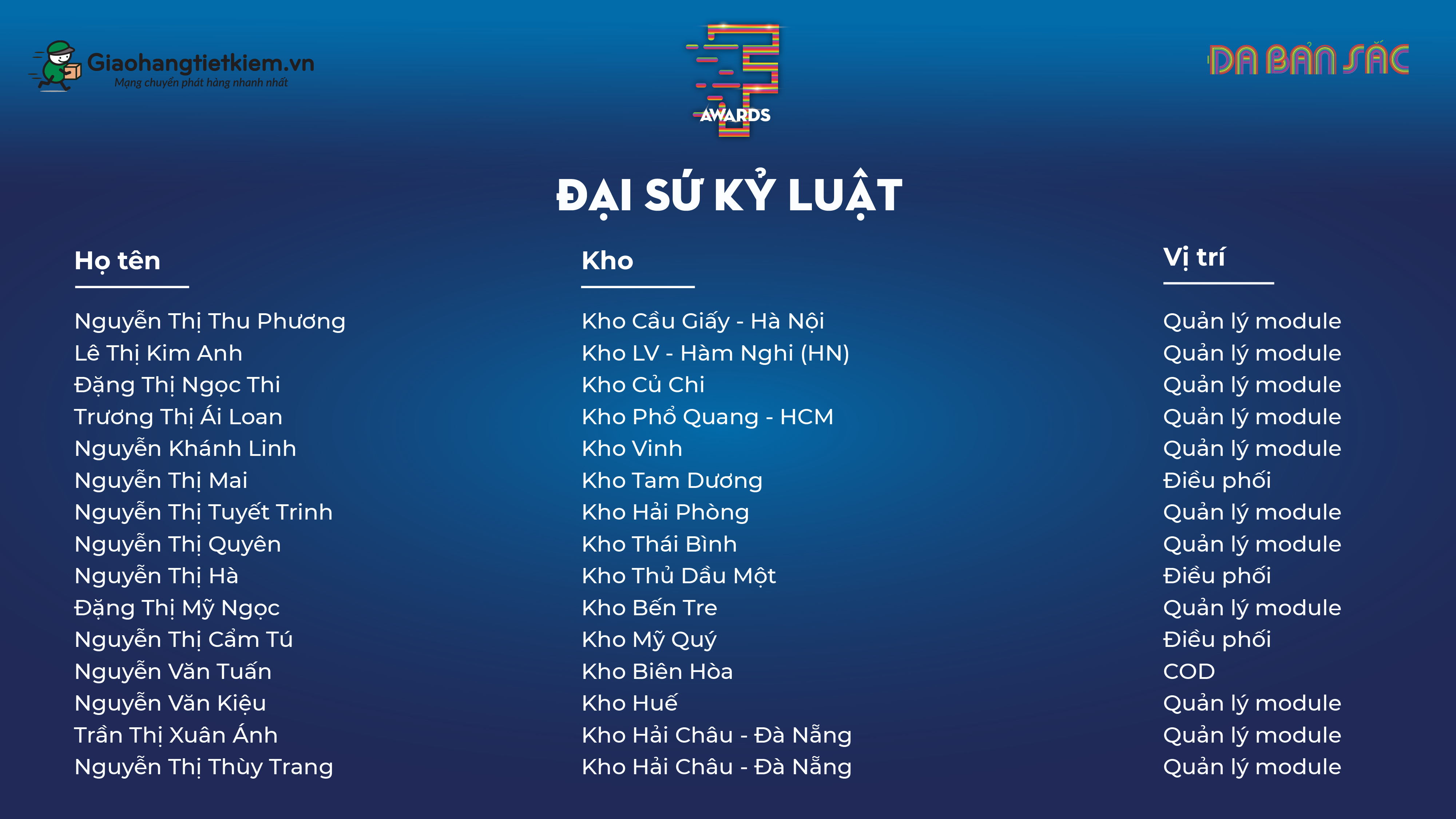 Với những nỗ lực và đóng góp của mình, các Đại sứ đã nhận được sự tin tưởng bầu chọn từ chính những đồng nghiệp tại GHTK. Đại sứ Bùi Duy Tuấn - kho Cẩm Phả đã chia sẻ ngay trên sân khấu rằng: "Danh hiệu Đại sứ Chăm chỉ khiến em tự hào vô cùng, thành quả này sẽ là động lực để em cố gắng hơn trong thời gian tới".
