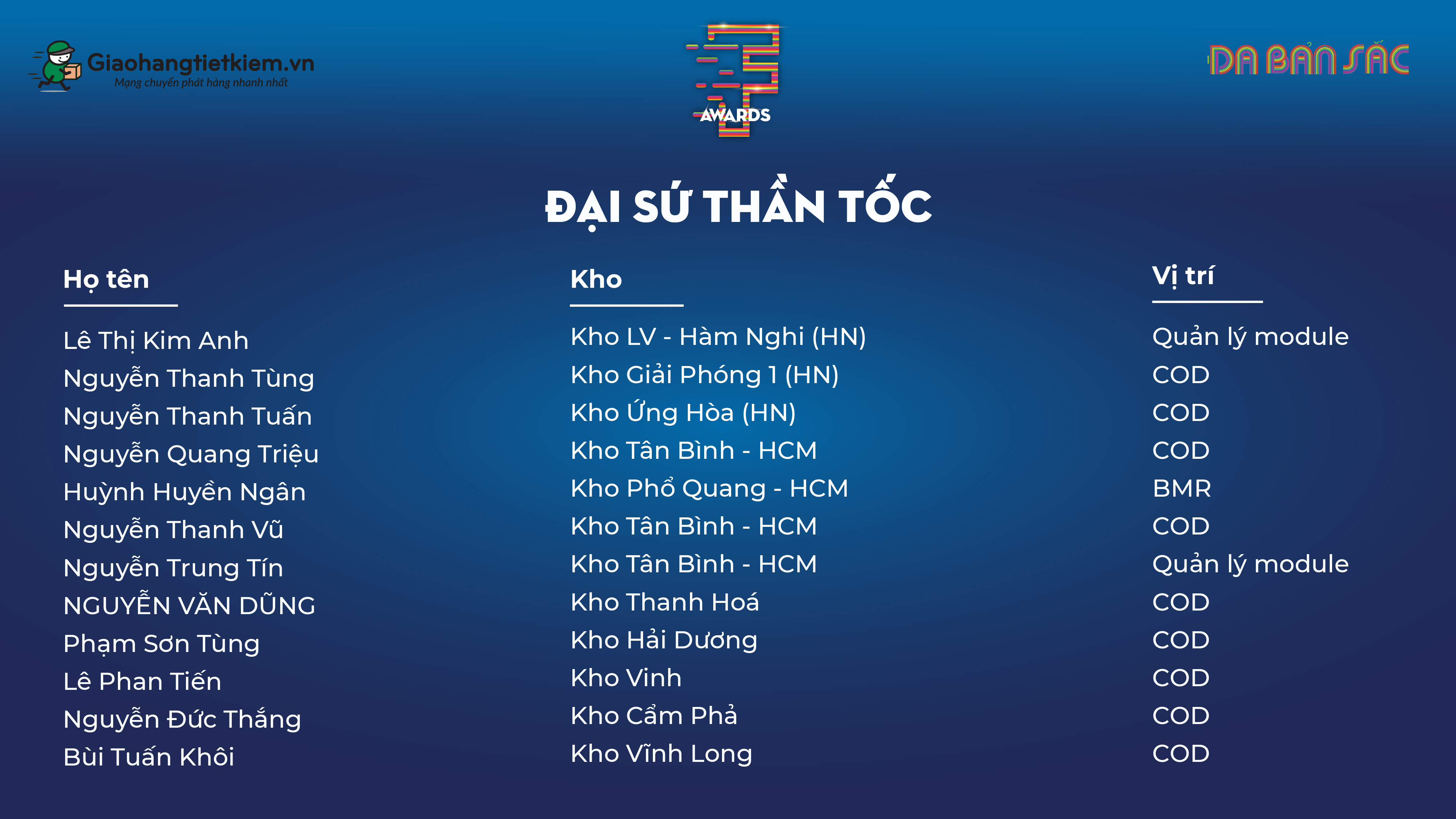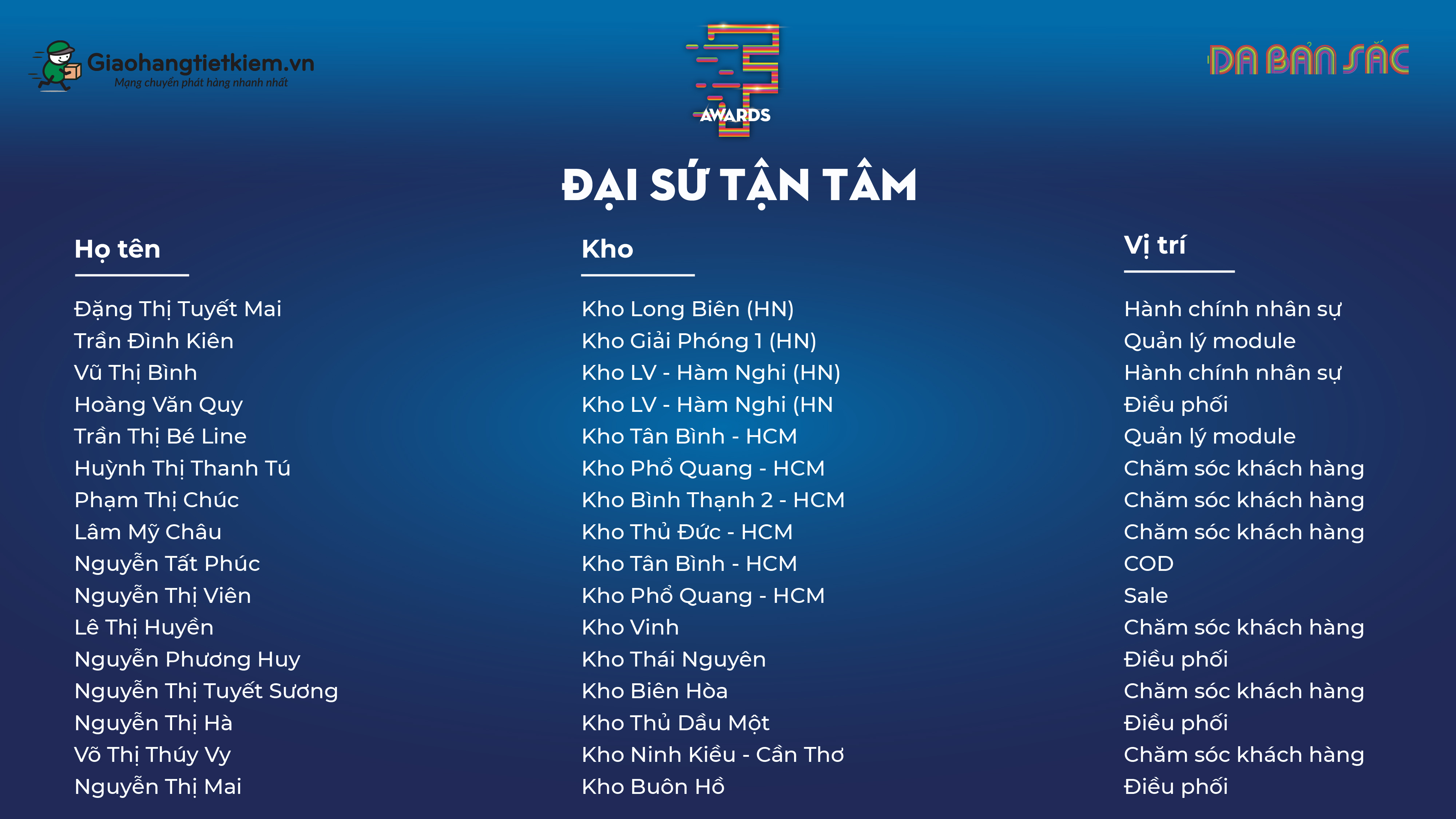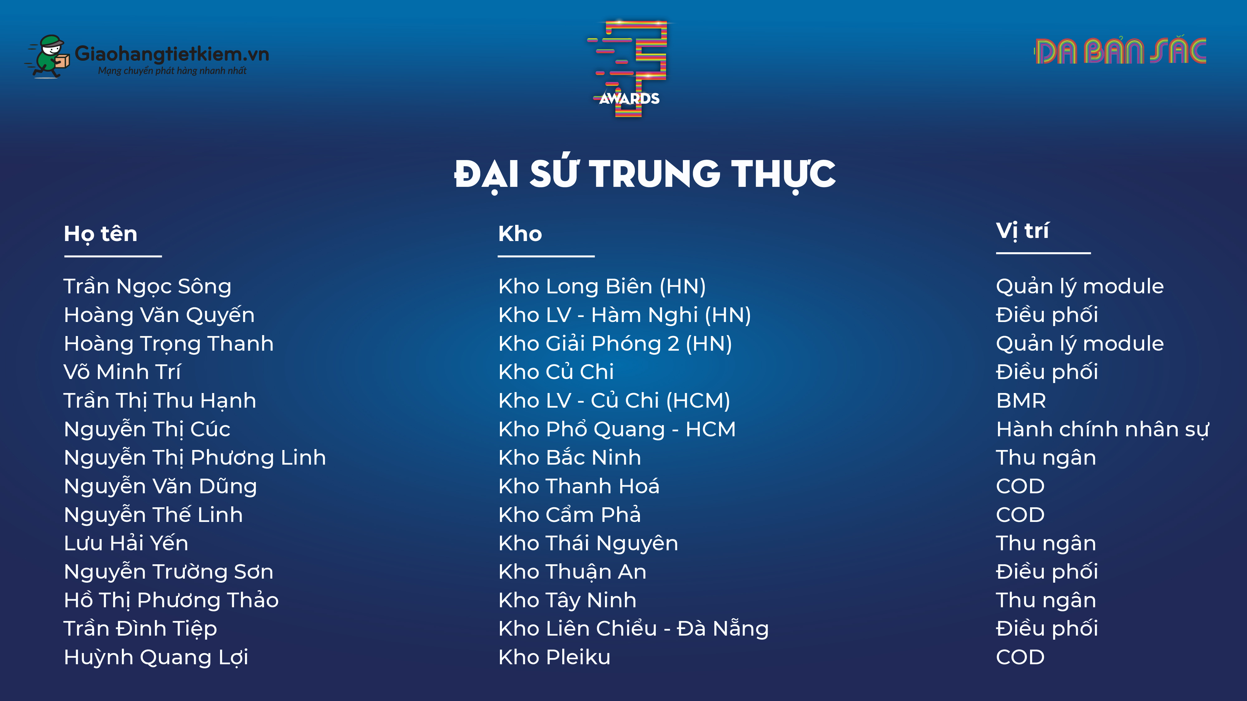 Với những nỗ lực và đóng góp của mình, các Đại sứ đã nhận được sự tin tưởng bầu chọn từ chính những đồng nghiệp tại GHTK. Đại sứ Bùi Duy Tuấn - kho Cẩm Phả đã chia sẻ ngay trên sân khấu rằng: "Danh hiệu Đại sứ Chăm chỉ khiến em tự hào vô cùng, thành quả này sẽ là động lực để em cố gắng hơn trong thời gian tới".