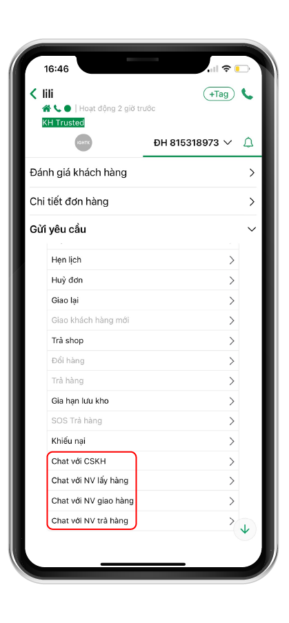- Click chọn "Chat với CSKH/Chat với NV lấy hàng/Chat với NV giao hàng/Chat với NV trả hàng"